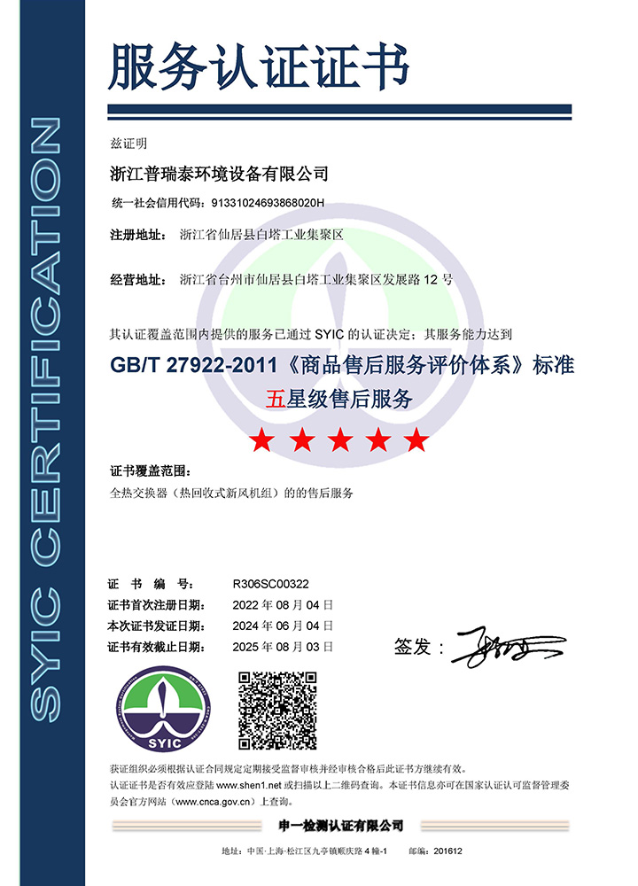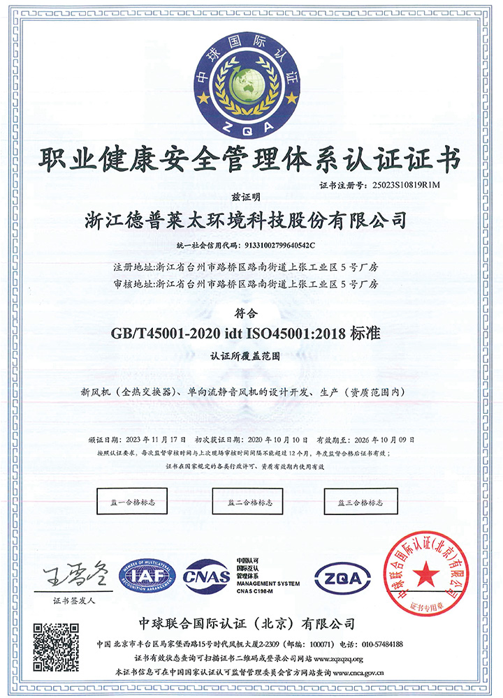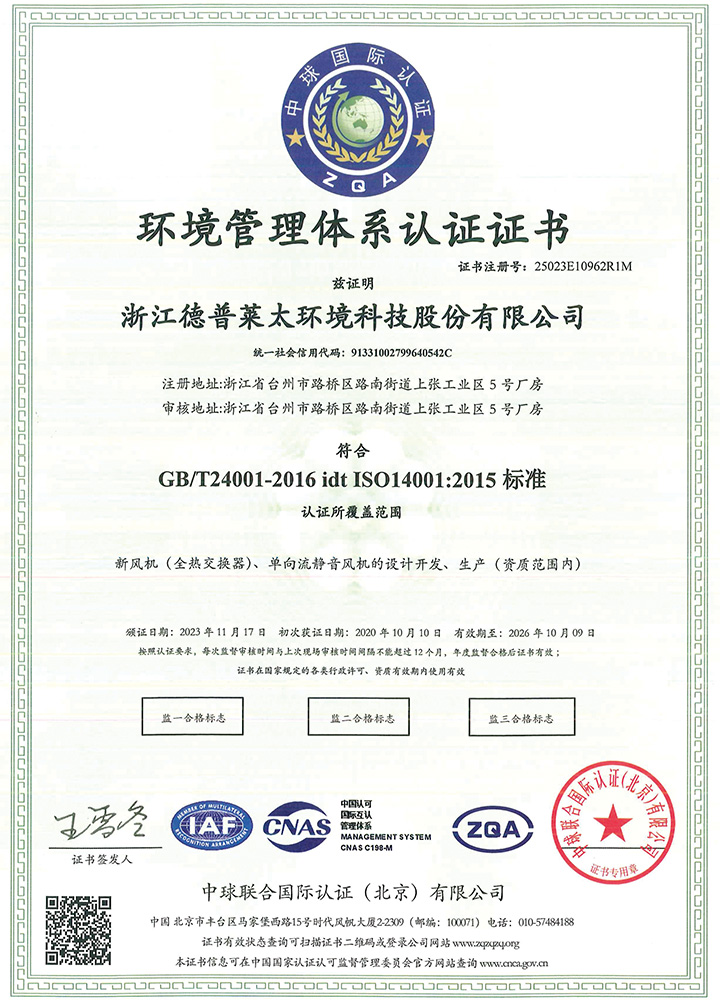 公司秉承“誠信、擔當、創新、共贏”的企業精神,產品制造精益求精,通過了ISO9001質量管理體系、ISO14001環境管理體系、ISO45001職業健康安全管理體系等認證。主導起草了T∕NAIC 001-2021《超低能耗建筑新風系統技術規程》、RISN-TG043-2022《居住建筑新風系統應用技術導則》等標準,參編了JGJ∕440-2018《住宅新風系統技術標準》、GB∕T 21087-2020《熱回收新風機組》、GB∕T 40438-2021《熱泵型新風環境控制一體機》、GB∕T 40379-2021《戶用和類似用途組合式空氣處理機組》等多項標準,擁有發明專利6項。公司是中國建筑金屬結構協會凈化與新風委員會副主任單位、被動式低能耗建筑產業技術創新戰略聯盟副理事長單位,被授予高新技術企業、浙江省專精特新中小企業、浙江省科技型中小企業、臺州市專精特新小巨人企業和國家級綠色(設計)產品、浙江制造精品、浙江制造認證證書等多項榮譽。